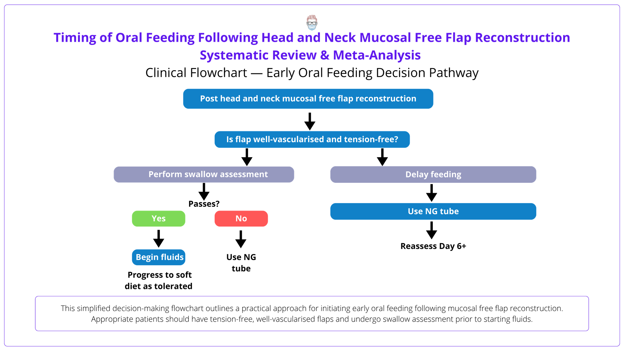 Flap failure rates remained consistent (~3%) regardless of feeding timing, and no increase in wound complications was observed. While protocol variability limits generalisation, this review offers strong support for a shift toward more proactive recovery planning.