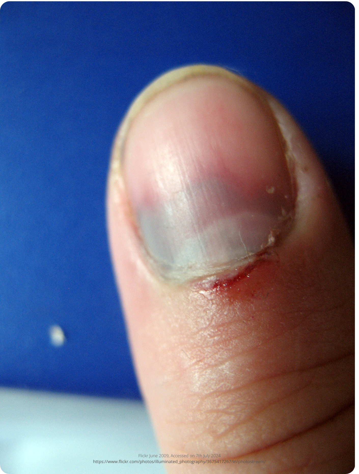 A 35-year-old female presents with severe, sharp, stabbing pain and tenderness in her left thumb, especially intense with cold exposure or pressure. The pain often wakes her at night. On examination, there is a small, bluish discolouration under the nail of the affected thumb.