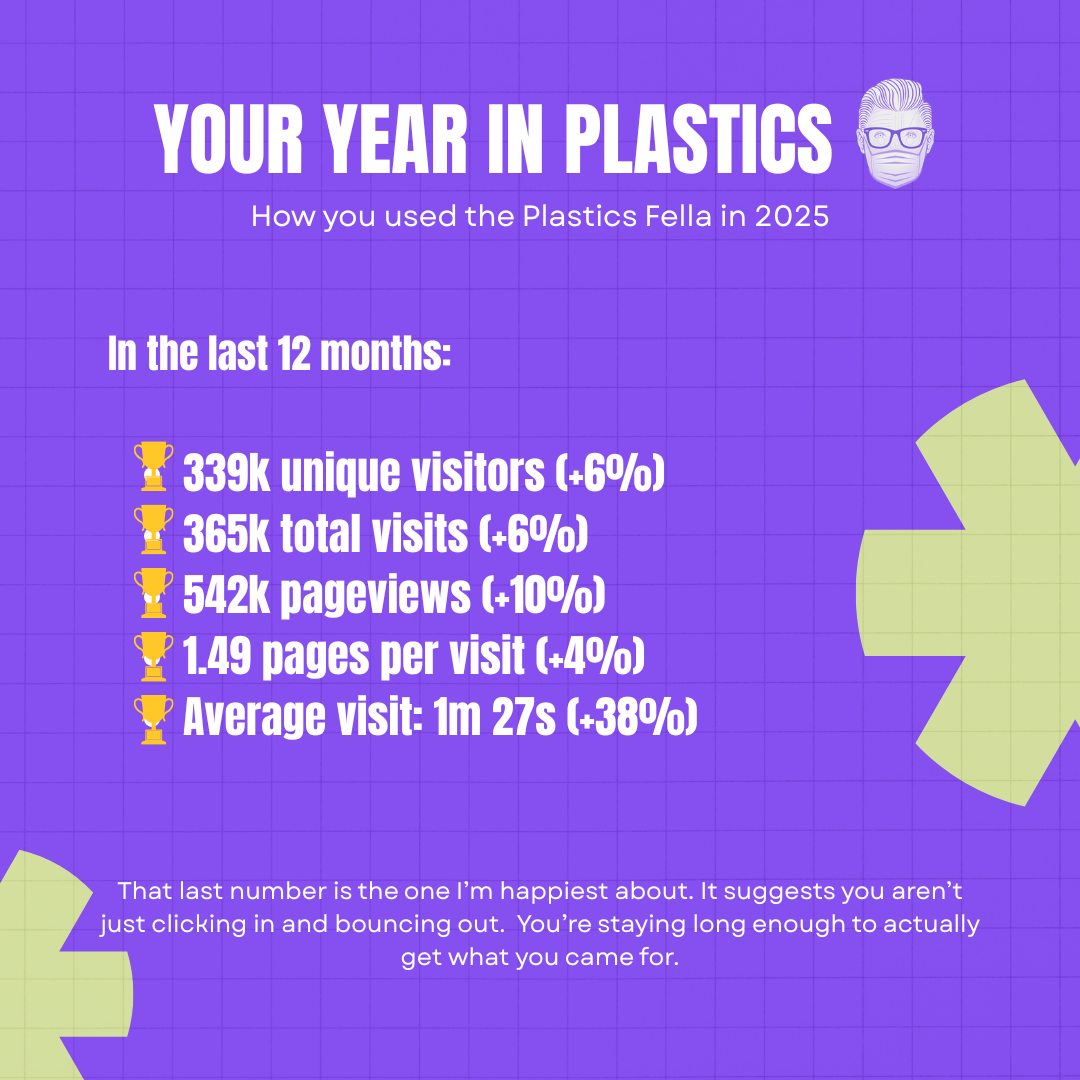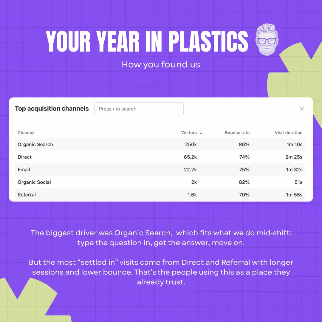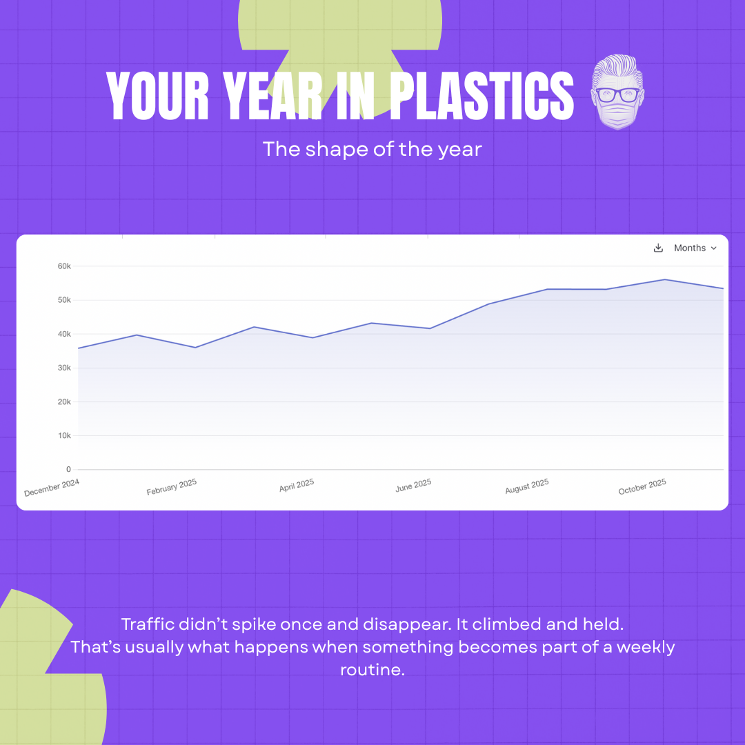 We’ve been going through the 2025 data, and the more we look at it, the less this feels like a story about traffic. It’s a story about behaviour. In 2025, people didn’t use thePlasticsFella like a website. Instead, they used it like a clinical tool: something you reach for under pressure, when you need clarity quickly.