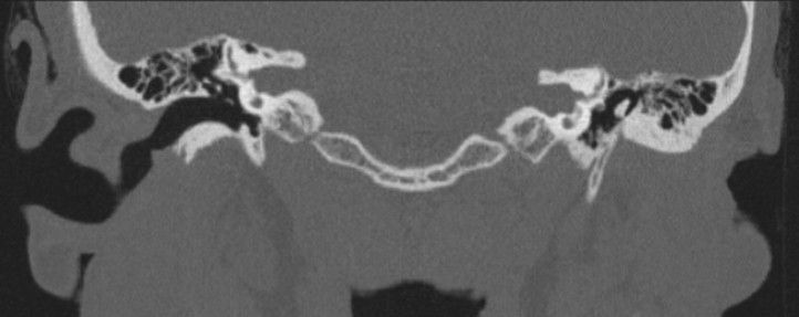 - Ossicles: disrupted or absent