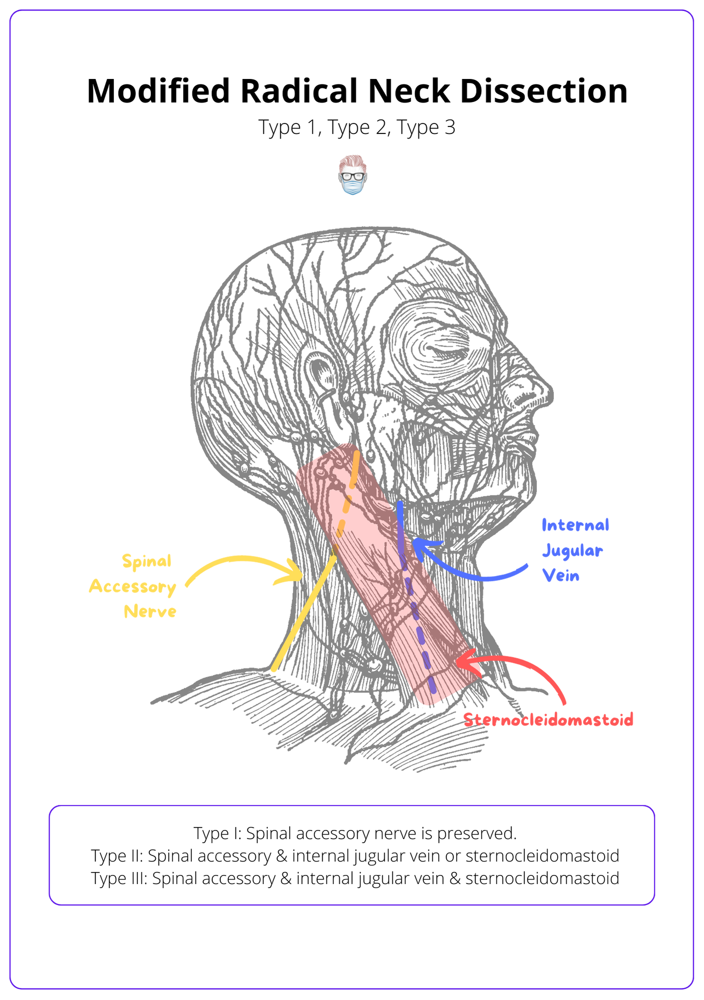 1. Types of Neck Dissections: You've gained knowledge about the various types of neck dissections — radical, modified radical, and selective — and their specific applications based on the extent of lymph node removal and the preservation of key anatomical structures.