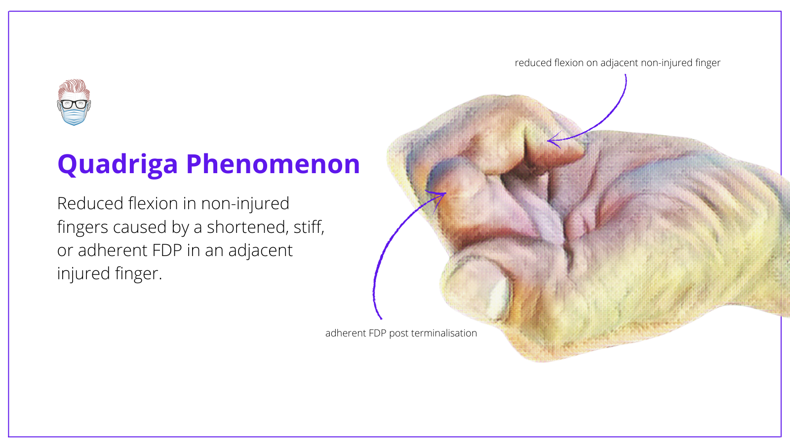 Quadriga phenomenon or syndrome is reduced flexion in non-injured fingers caused by a shortened, stiff, or adherent FDP in an adjacent injured finger.