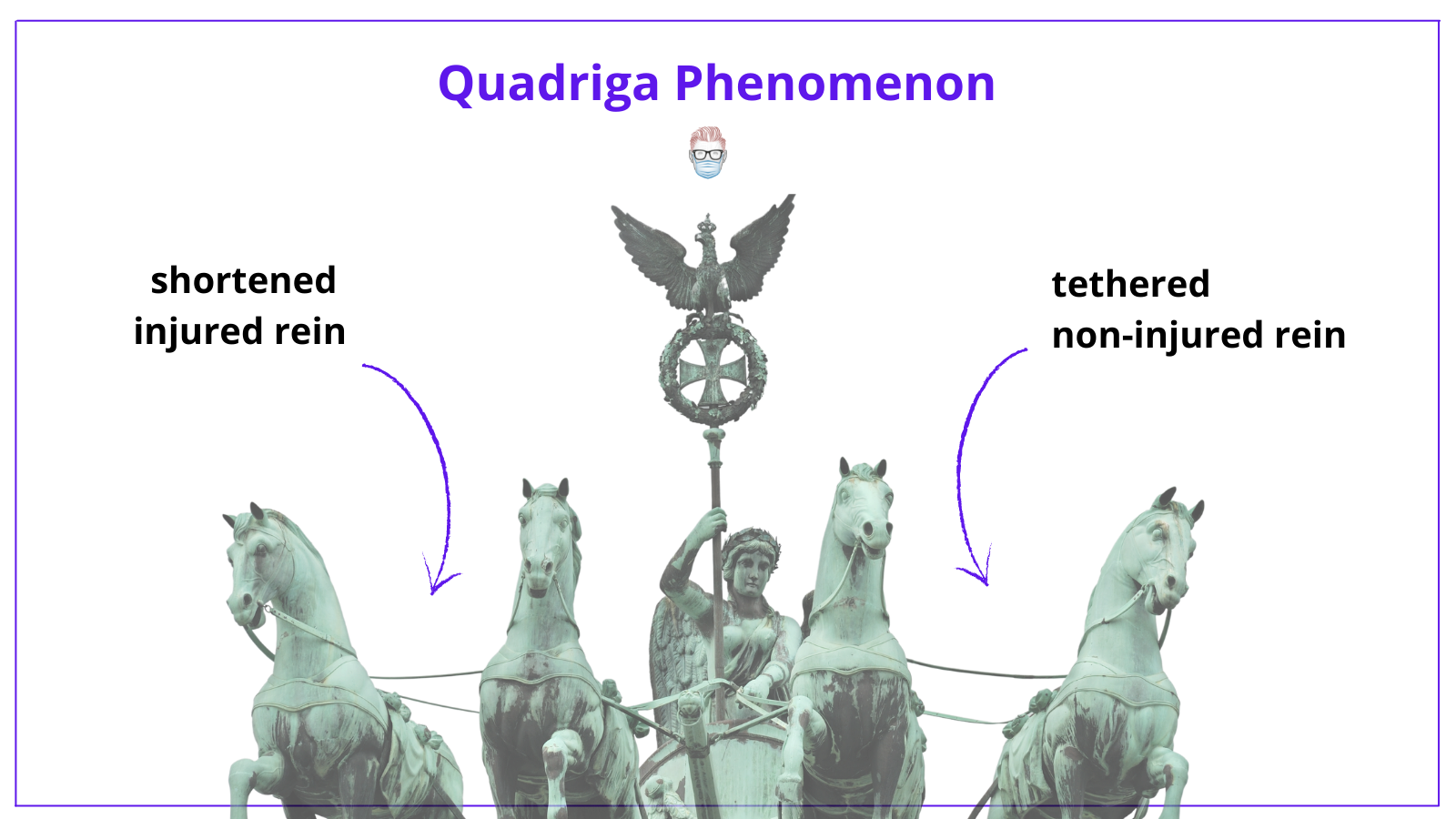 Quadriga refers to the 4-horse Roman chariots controlled by 1 driver through 1 common rein. If that rein becomes shortened to one horse then the other horses will experience a tethering effect.