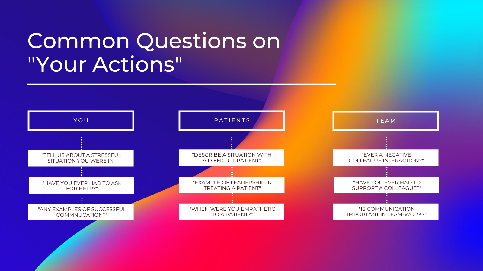 There are specific themes to the "action" questions. But it's important for your brain to be able to recognise them quickly. After all, you really only have a few seconds in the interview to think. Below is the commonest questions asked, and when you hear them, you should flick on the "SCARRED answer structure template"