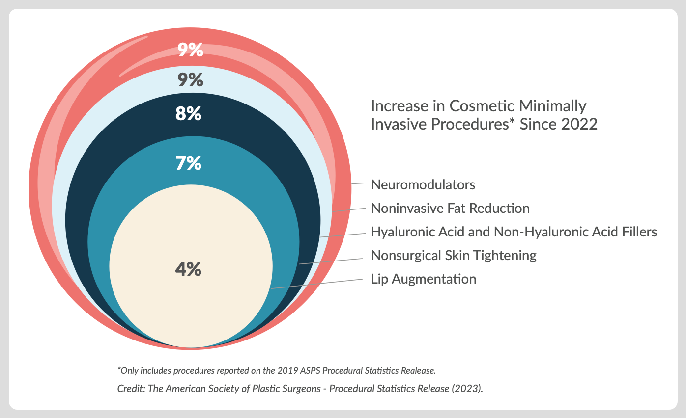 With Botox and dermal fillers up by 6% and 4%, respectively, it’s clear that patients are opting for non-surgical solutions that offer quick results with minimal recovery time. The continued rise in minimally invasive procedures reflects a strong demand for effective, time-efficient aesthetic treatments.