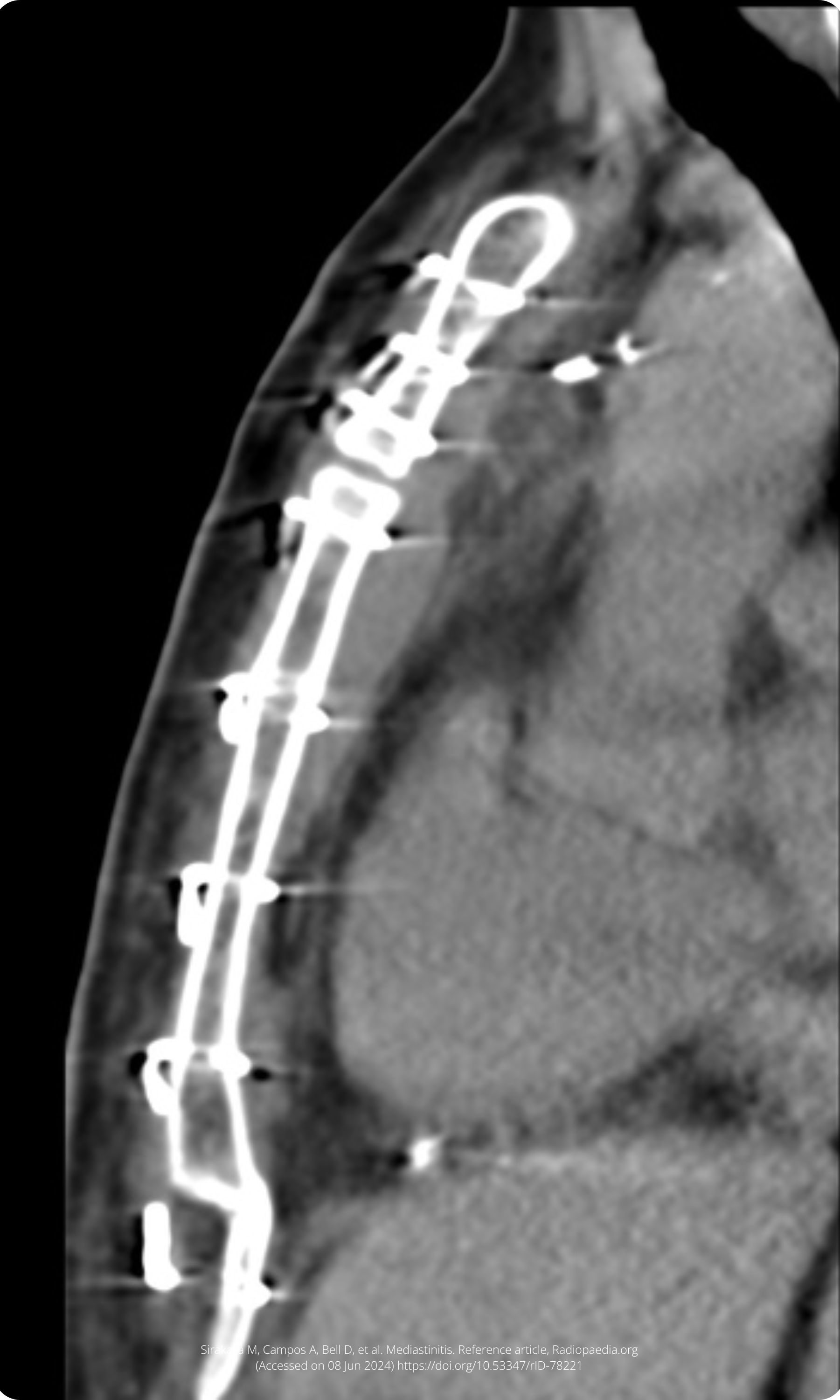 A 57-year-old lady presents with a sternal wound sinus 4 weeks after a median sternotomy for a mitral valve replacement.