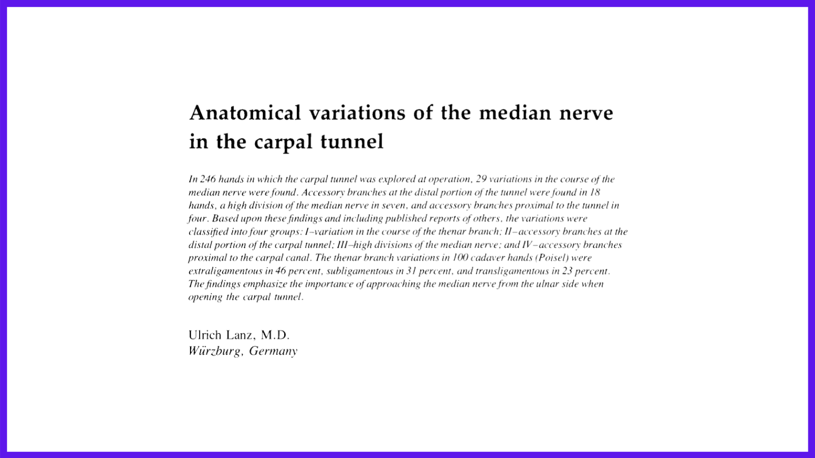 Ulrich Lanz published in seminal work in the The Journal of Hand Surgery, January, 1977, Vol. 2 No. I, pp. 44-53. He analysed the branching pattern of the median nerve within the carpal tunnel in 246 hands.